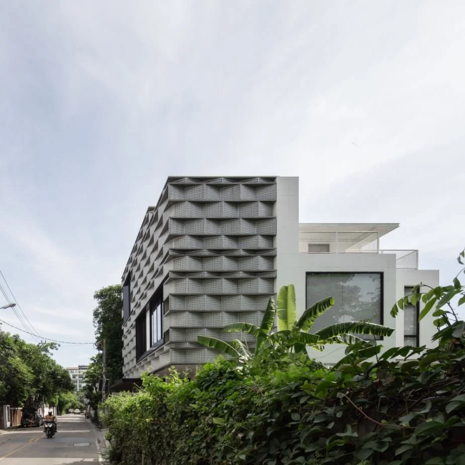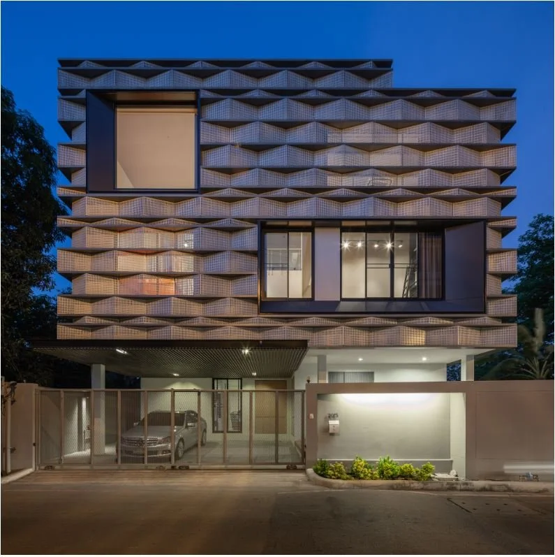 Upon our initial visit to the site, we discovered that the house was highly visible from the busy street, inspiring us to prioritize the privacy and security of the residents in our design. Our solution was a multi-layered facade system that would redefine the boundary between the public street and the internal space of the house. A pleated perforated aluminum facade was utilized to block visibility from the street while still allowing natural light to filter into the living space.