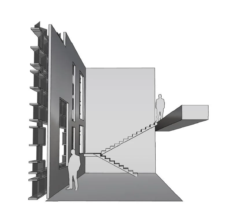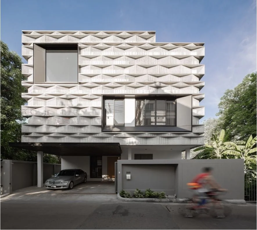 We envisioned a multi-layered facade system that would redefine the boundary between the public street and the internal space of the house. The pleated perforated aluminum facade helps to block the visibility of the people from the street outside while allowing the living space inside to receive natural light and allowing some visibility of the outside environment.